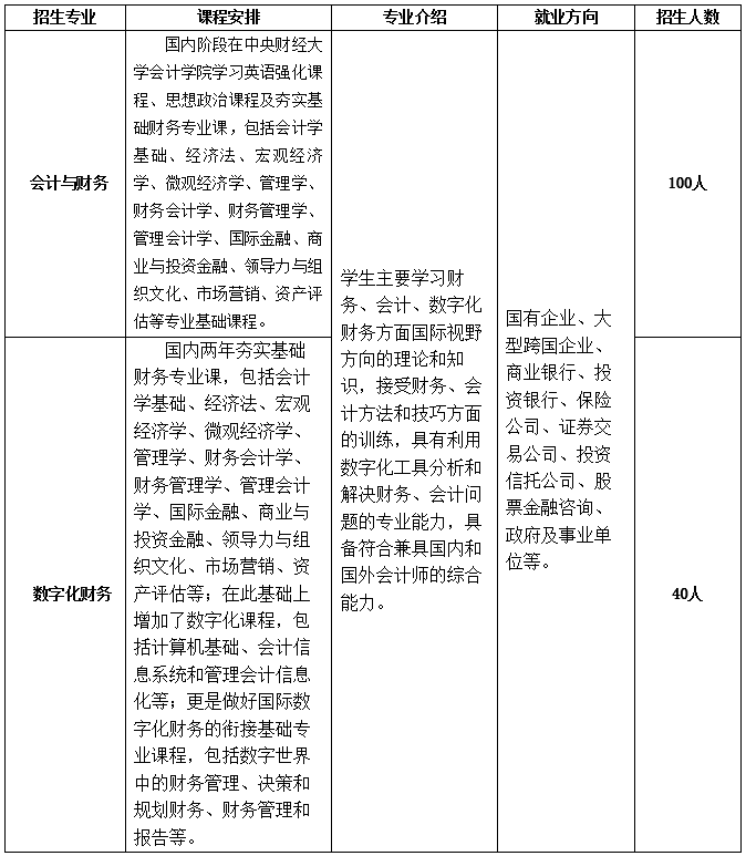 国外阶段:员工完成两年国内学习课程,从培训院校结业,达到雅思6.0或以上水平,赴国外留学注册为外国大学学籍,外方合作院校经过对国内院校培训课程的评估,根据留学培训项目员工的学习成绩及在国内的培训经历,依据该校和该国相关规定,接受有关员工赴该校留学并豁免该员工在该校的部分学分或免修部分课程(豁免学分不超过本科阶段总学分的1/3),员工在国外学习课程主要包括:专业会计师、公司报告、商务分析、高级财务管理、高级业绩管理、高级税务管理、高级审计与认证业务等课程,员工完成课程学习并满足国外大学毕业要求,将可获得国外大学学士学位。员工完成国外两年学习并满足国外大学入学要求的可以申请英国、澳大利亚、新加坡名校硕士机会。