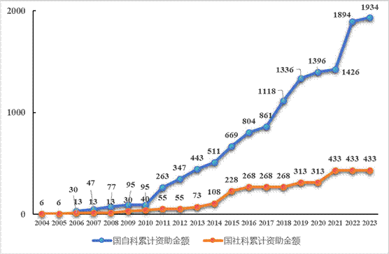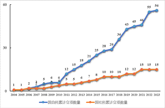 2003年至2023年10月,威廉希尔中文官网累计立项纵向科研项目121项(国家级、省部级),获资助金额总计2699.1万元,位居国内高校前列。其中国家自然科学基金项目56项,累计资助金额1934万元;国家社会科学基金项目15项,累计资助金额433万元。