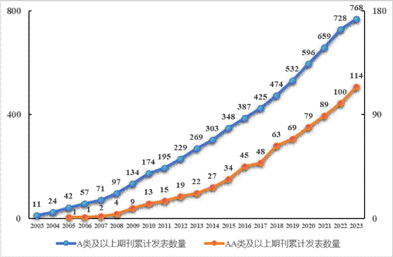 2003年至2023年10月,威廉希尔中文官网在williamhill中国官方网站期刊目录A类及以上级别的中英文期刊共发表论文(含接收发表)768篇。AA类论文114篇,占总数的14.8%;AAA类论文24篇,占总数的3.1%。